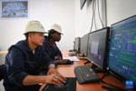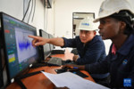 9月9日,在位于肯尼亚纳库鲁郡的索西安地热电站,方文军(中)指导当地工友进行设备操控。新华社记者 韩旭 摄