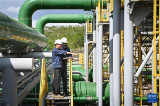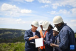 9月9日,在位于肯尼亚纳库鲁郡的索西安地热电站,方文军与当地工友巡视检查管道。新华社记者 韩旭 摄