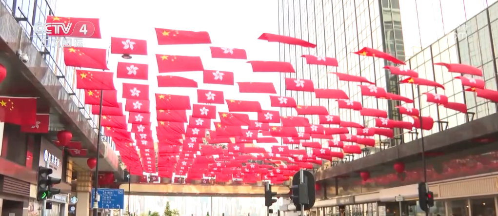 香港大街小巷五星红旗和特区区旗迎风飘扬,处处闪耀着中国红,城市一派喜庆祥和。