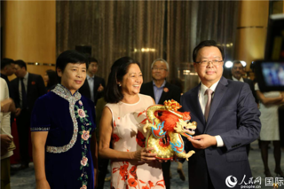 菲律宾总统夫人丽莎·马科斯(左三)、菲律宾参议长弗朗西斯·埃斯库德罗(右二),菲律宾政府有关部门负责人等出席招待会。人民网记者 樊帆摄