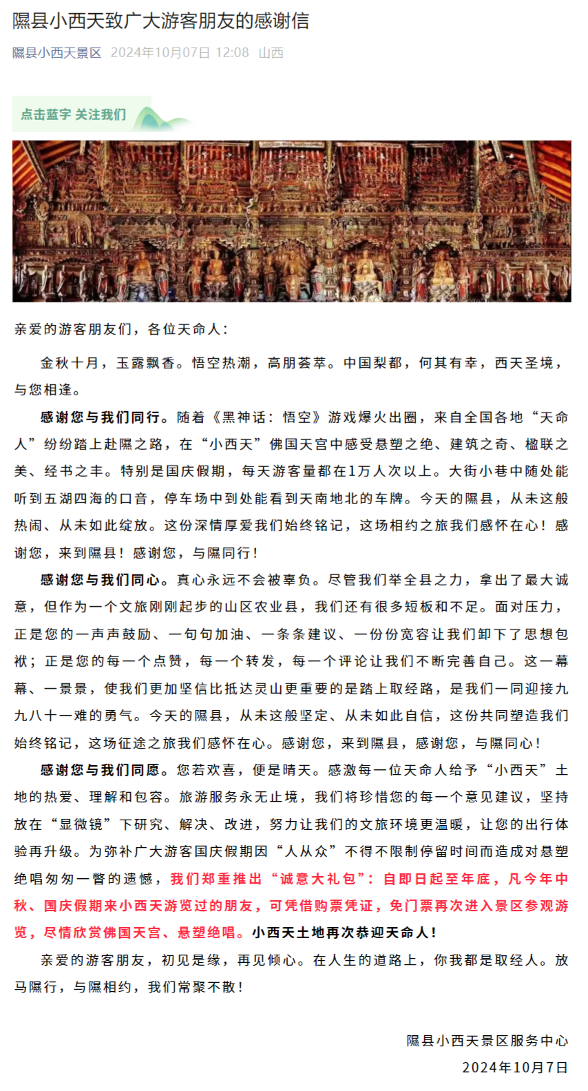 央视网消息:据隰县小西天景区微信公号消息,自即日起至年底,凡今年中秋、国庆假期来小西天游览过的朋友,可凭借购票凭证,免门票再次进入景区参观游览,尽情欣赏佛国天宫、悬塑绝唱。小西天土地再次恭迎天命人!
