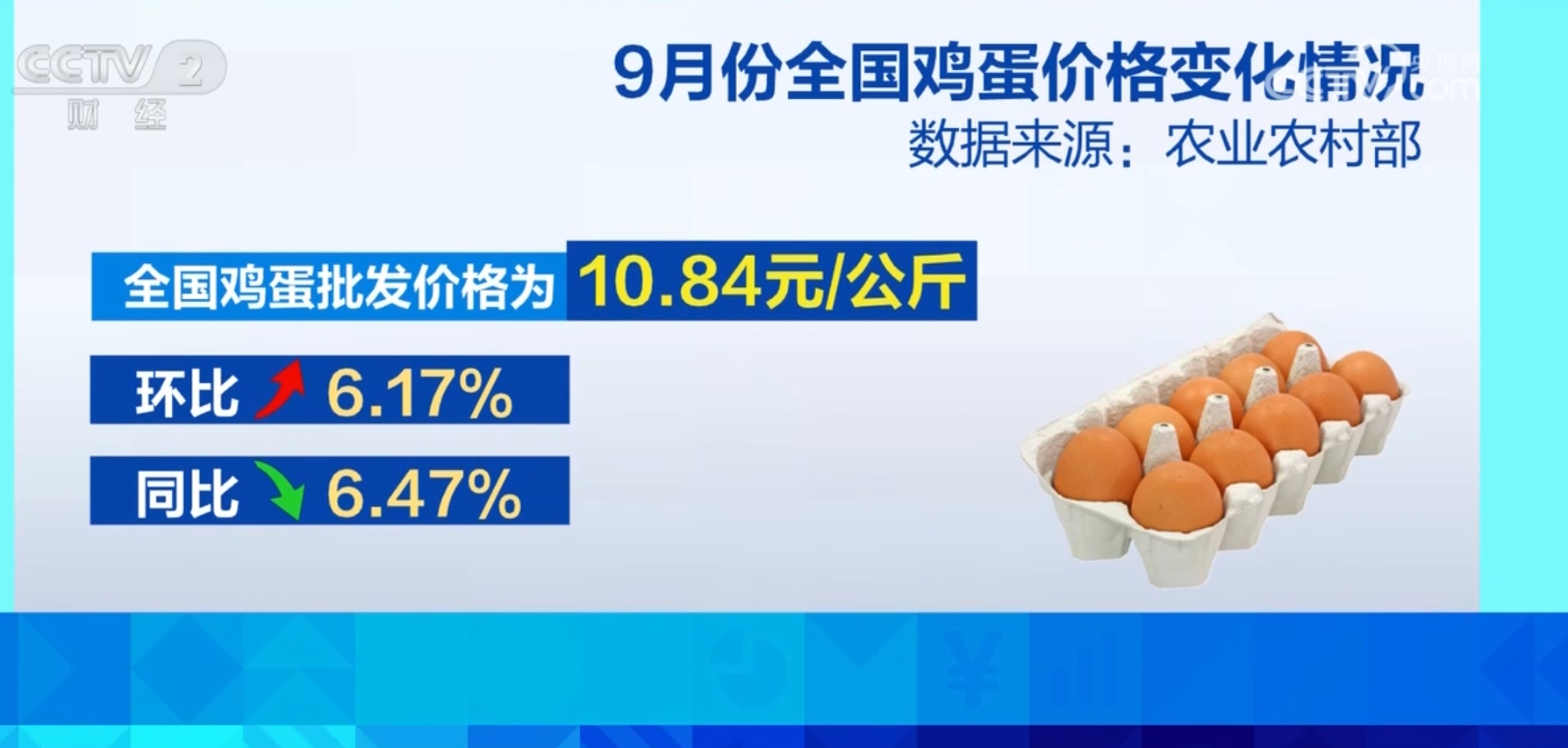 据农业农村部监测,9月份,全国鸡蛋批发价格为每公斤10.84元,环比上涨6.17%,同比下降6.47%。