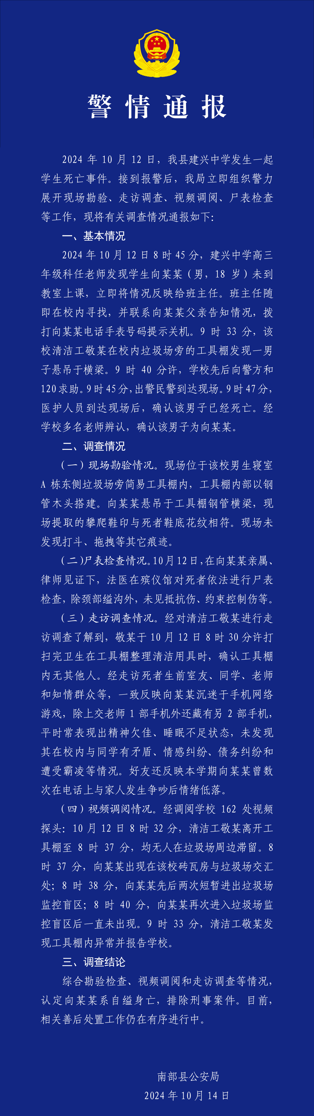 央视网消息:10月14日,四川南部县公安局发布警情通报:10月12日,我县建兴中学发生一起学生死亡事件。接到报警后,我局立即组织警力展开现场勘验、走访调查、视频调阅、尸表检查等工作,现将有关调查情况通报如下。
