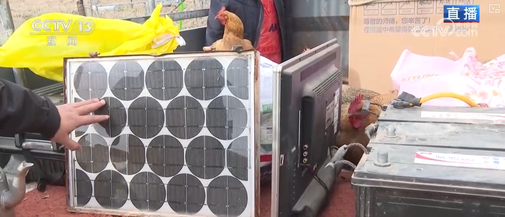 除了行李,还有这个电视,看电视是尼玛采楞最大的爱好,但是这个电视尺寸为什么会这么小?这是因为尼玛采楞山下借牧点接电需要靠这个太阳能板和电池组,电视大了功率就大,看的时间就少。因此带个小电视,电瓶里的电就能让他看到晚上12点,电量绰绰有余。等会儿装完车,尼玛采楞就要带着羊群转场去借牧点。