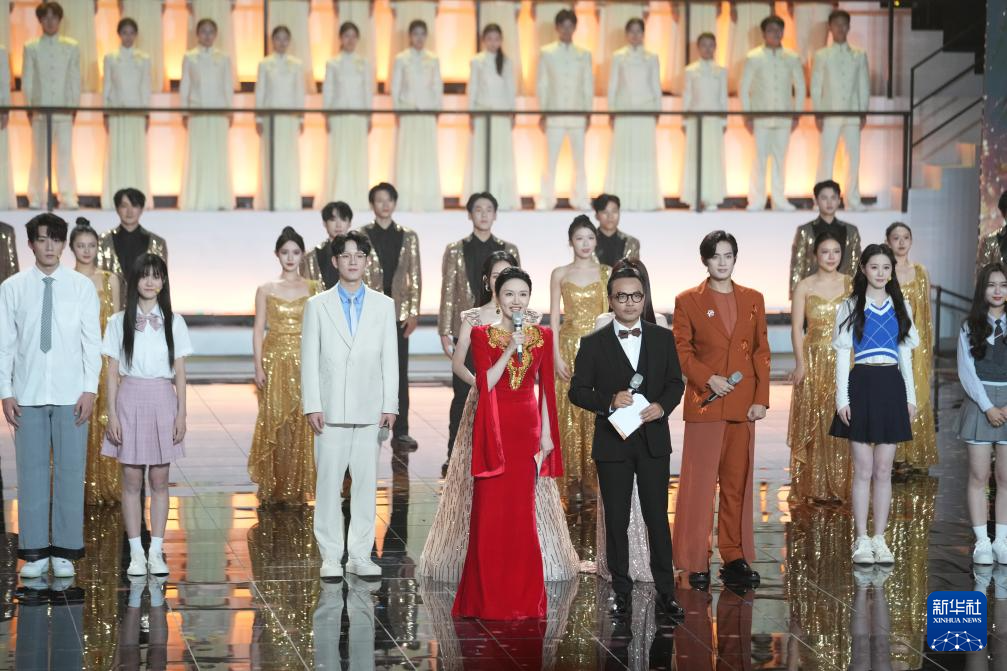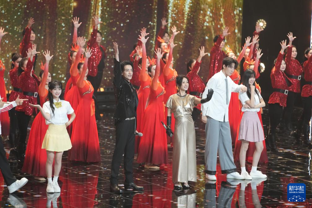 10月18日,演员秦海璐(前右三)和歌手郑云龙(前右四)在第15届中国金鹰电视艺术节开幕式文艺晚会现场表演。新华社记者 薛宇舸 摄