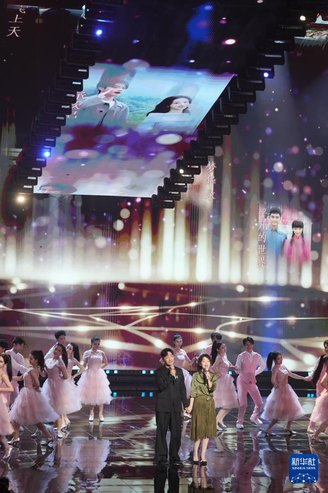 10月18日,演员郭晓东(前左)与演员闫妮(前右)在第15届中国金鹰电视艺术节开幕式文艺晚会现场表演。新华社记者 薛宇舸 摄