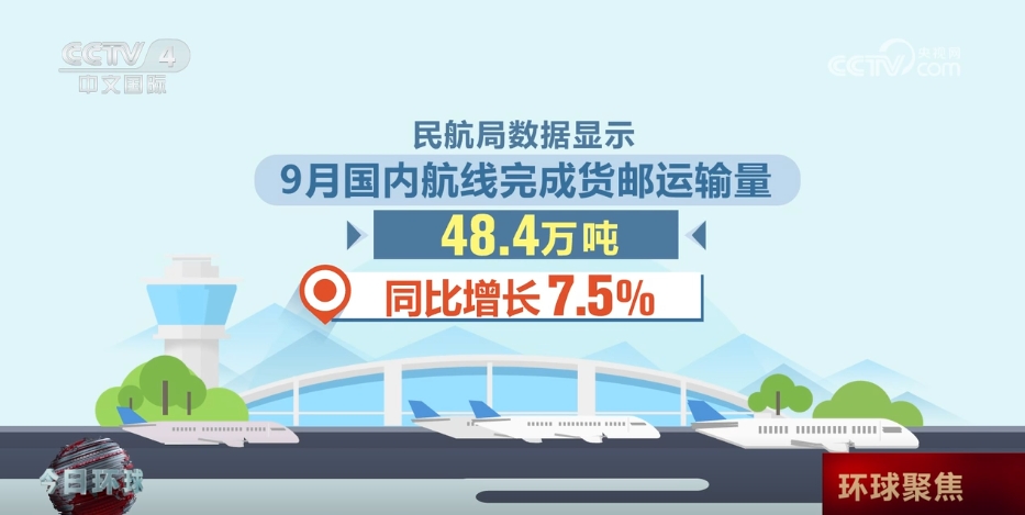 民航局数据显示,9月国内航线完成货邮运输量48.4万吨,同比增长7.5%;国际航线完成货邮运输量31.5万吨,同比增长25.3%。