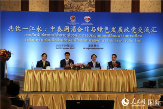 人民网曼谷10月23日电(记者简承渊、实习生姚欣可)22日,“共饮一江水:中泰澜湄合作与绿色发展政党交流汇”在泰国曼谷举行。中共中央委员、青海省委书记陈刚,中国驻泰国大使韩志强,泰国前国会主席、泰中文化经济协会会长颇钦,泰国前总理阿披实,为泰党发言人阿努蓬等嘉宾出席,来自泰政党、政府、国会、机构等各界友好人士200余人参会。