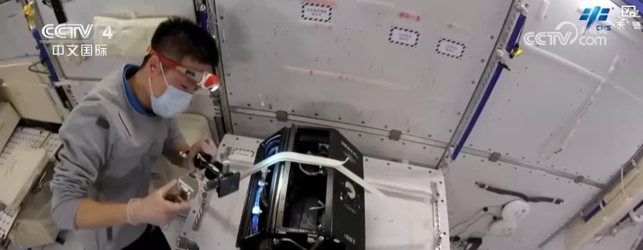 国家太空实验室内,空间材料科学、微重力流体物理与燃烧科学等领域实验持续开展,乘组按计划进行了燃烧柜气体实验插件燃烧器更换、流体物理实验柜实验样品更换。