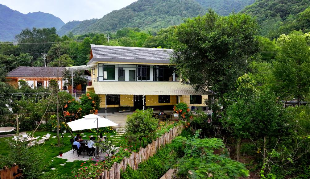 陕西省汉中市留坝县紫柏街道小留坝村的民宿(2023年7月24日摄,无人机照片)。新华社记者 刘潇 摄