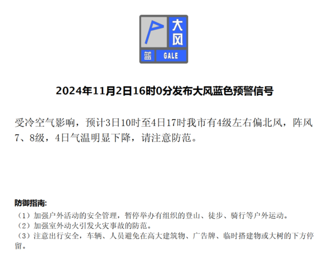 北京发布大风蓝色预警 来源:央视网 2024-11-02 16:26 央视网消息:据气象北京微信公众号消息,北京发布大风蓝色预警:受冷空气影响,预计3日10时至4日17时北京市有4级左右偏北风,阵风7、8级,4日气温明显下降,请注意防范。