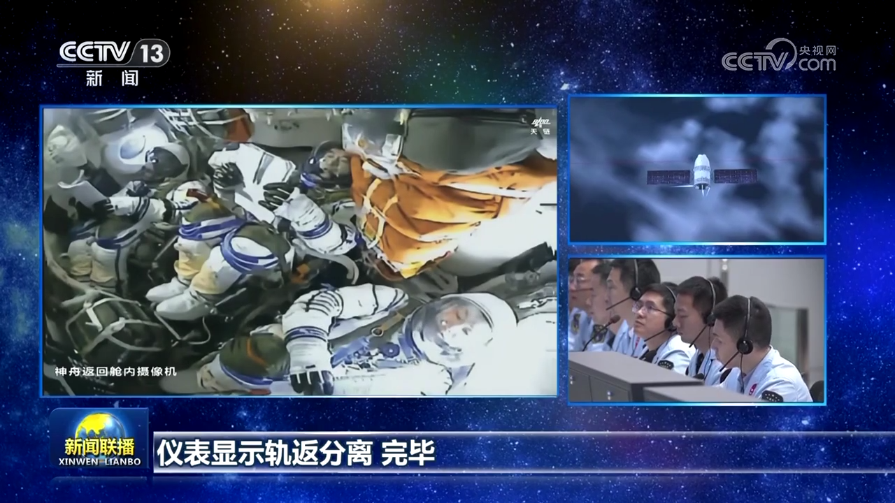 0时34分,北京航天飞行控制中心通过地面测控站发出返回指令,神舟十八号载人飞船轨道舱与返回舱成功分离。之后,飞船返回制动发动机点火。