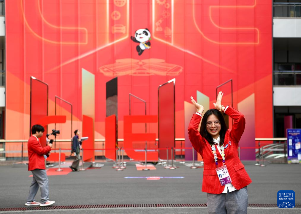 11月4日,志愿者在第七届中国国际进口博览会举办场地——国家会展中心(上海)留影。新华社记者 金马梦妮 摄