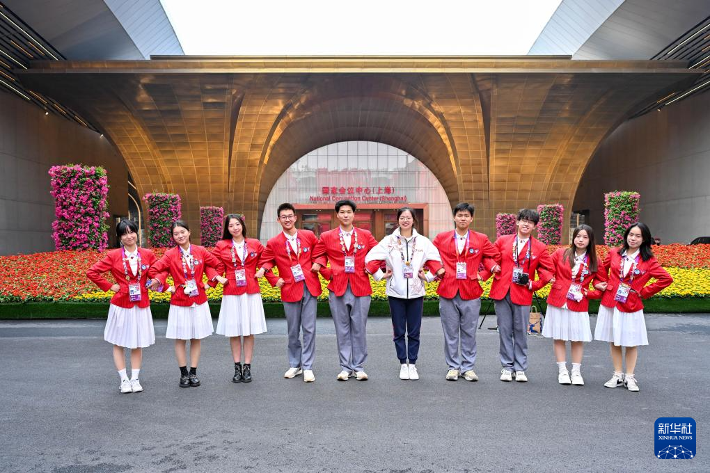 11月4日,志愿者在第七届中国国际进口博览会举办场地——国家会展中心(上海)合影。新华社记者 张铖 摄