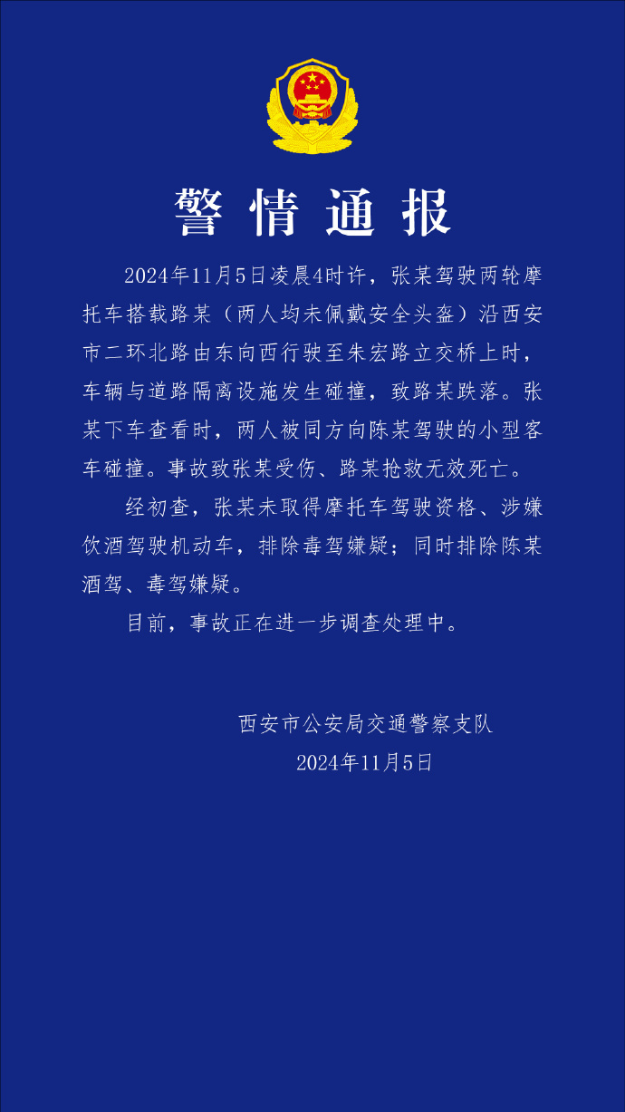 央视网消息:11月5日晚,西安市公安局交通警察支队发布情况通报:11月5日凌晨4时许,张某驾驶两轮摩托车搭载路某(两人均未佩戴安全头盔)沿西安市二环北路由东向西行驶至朱宏路立交桥上时,车辆与道路隔离设施发生碰撞,致路某跌落。张某下车查看时,两人被同方向陈某驾驶的小型客车碰撞。事故致张某受伤、路某抢救无效死亡。