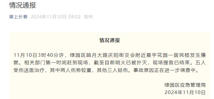 央视网消息:据掌上长春微信公众号消息,长春市绿园区应急管理局2024年11月10日通报:11月10日3时40分许,绿园区皓月大路庆阳街交会附近星宇花园一居民楼发生爆燃。相关部门第一时间赶到现场,截至目前明火已被扑灭,现场搜救已结束。五人受伤送医治疗,其中两人伤势较重,其他三人轻伤。事故原因正在进一步调查中。