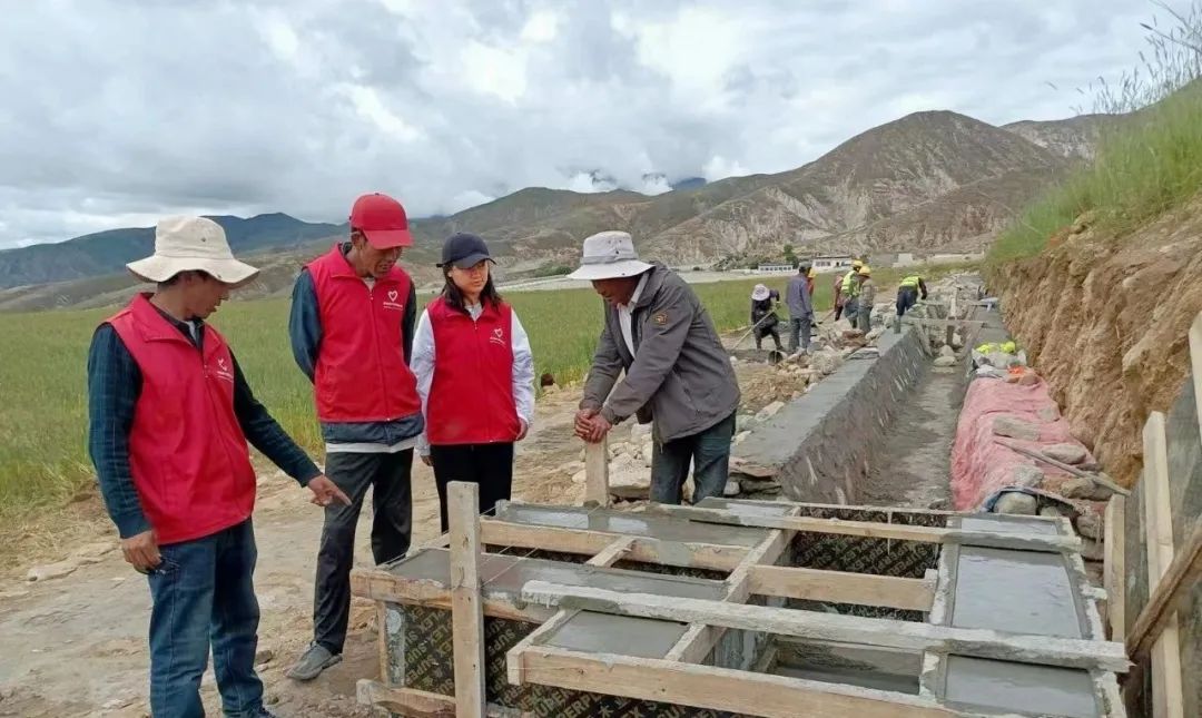 图说:青青(左三)正与村两委查看村内水渠项目施工情况。