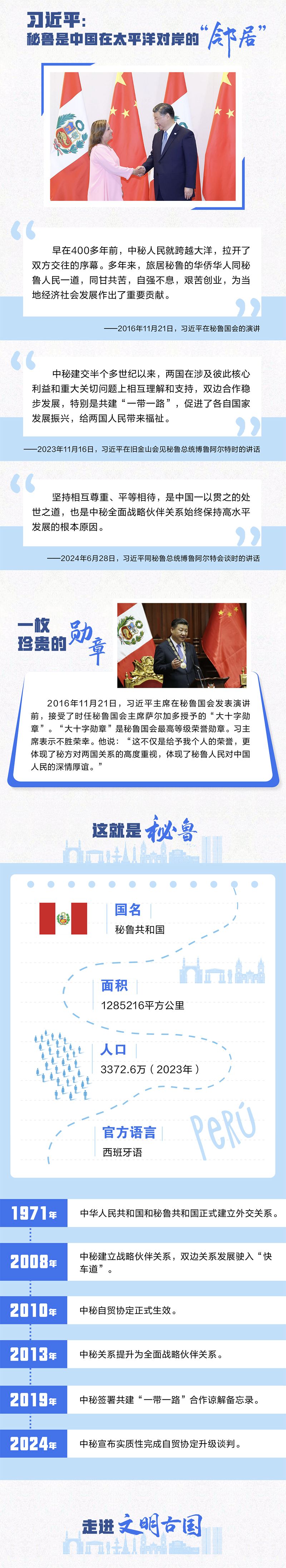 中国和秘鲁都是文明古国,两国友谊源远流长,人民友好深入人心。习近平主席曾以“秘鲁是中国在太平洋对岸的‘邻居’”形容中秘关系,生动诠释了两国和两国人民之间“相知无远近”的深厚友谊。