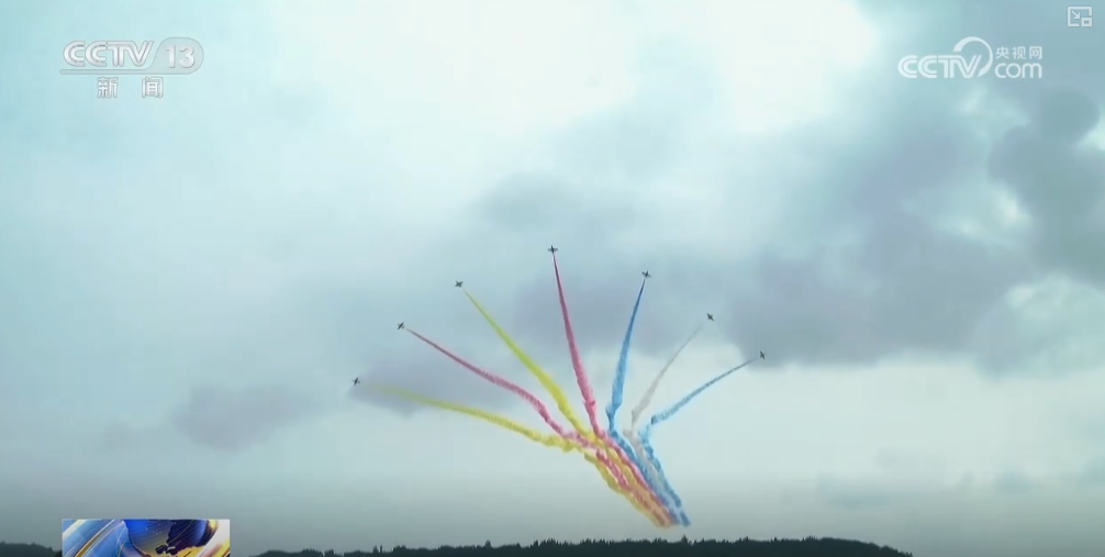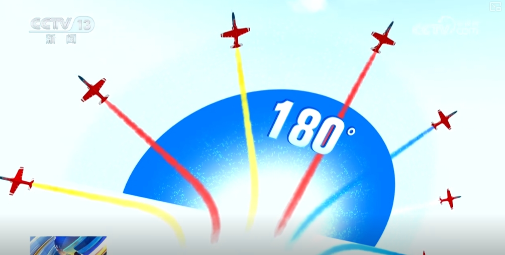 与此同时,机群原本的“雁形编队”开始发生急剧变化,在爬升至300米左右的高度时,飞机与飞机之间由“等距前进”快速变化为“间隔30度夹角散开”,整个编队在瞬间呈180度,向7个不同方向飞行。在空中留下7道美丽的彩色弧线,宛若一只孔雀张开了绚丽的尾羽。