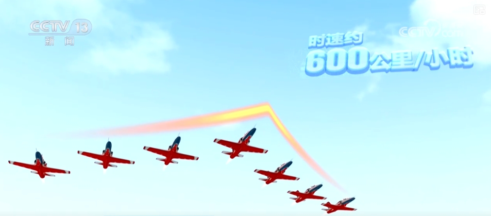 这个动作由7架飞机完成,编队在200米空中组成“雁形编队”,从观礼台的正前方飞来,时速约为600公里。在观礼台前方1公里左右时,长机一声令下,编队在小幅度向下加速俯冲后,迅速开始加大马力向上爬升。