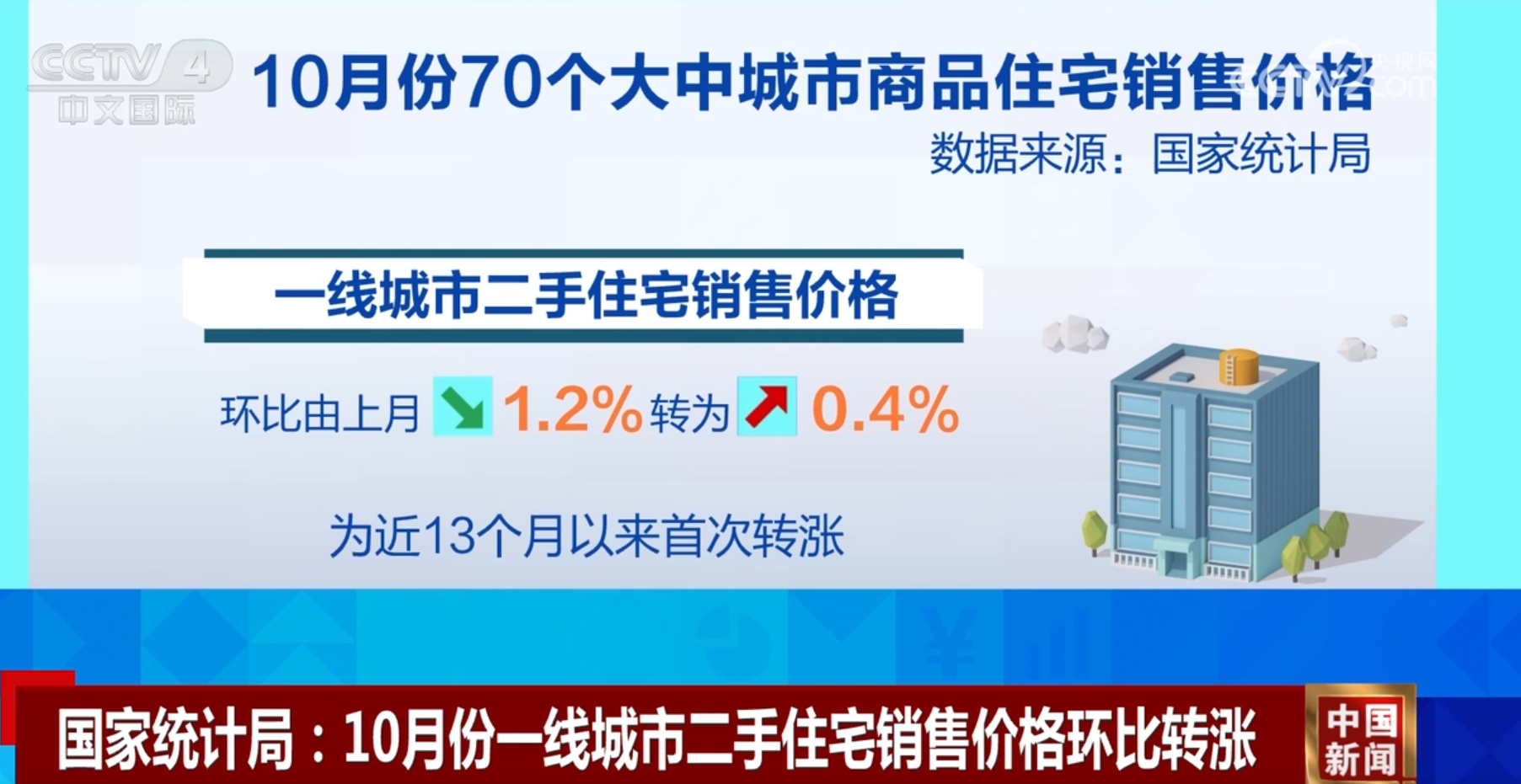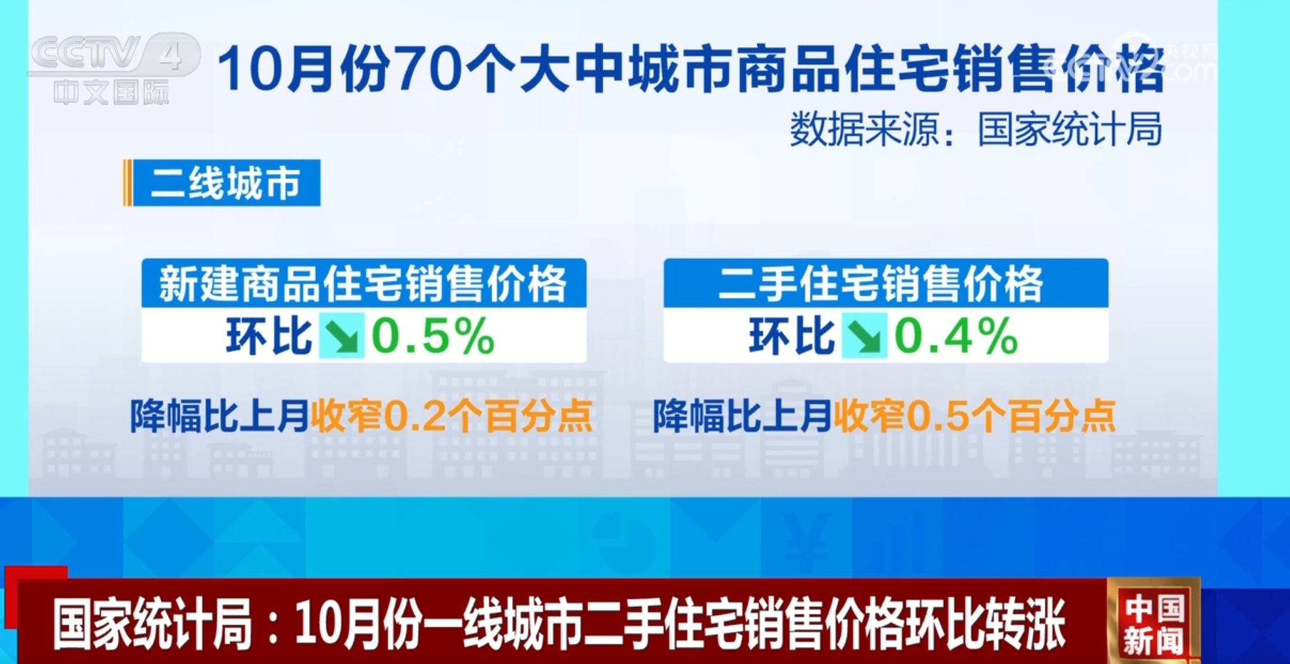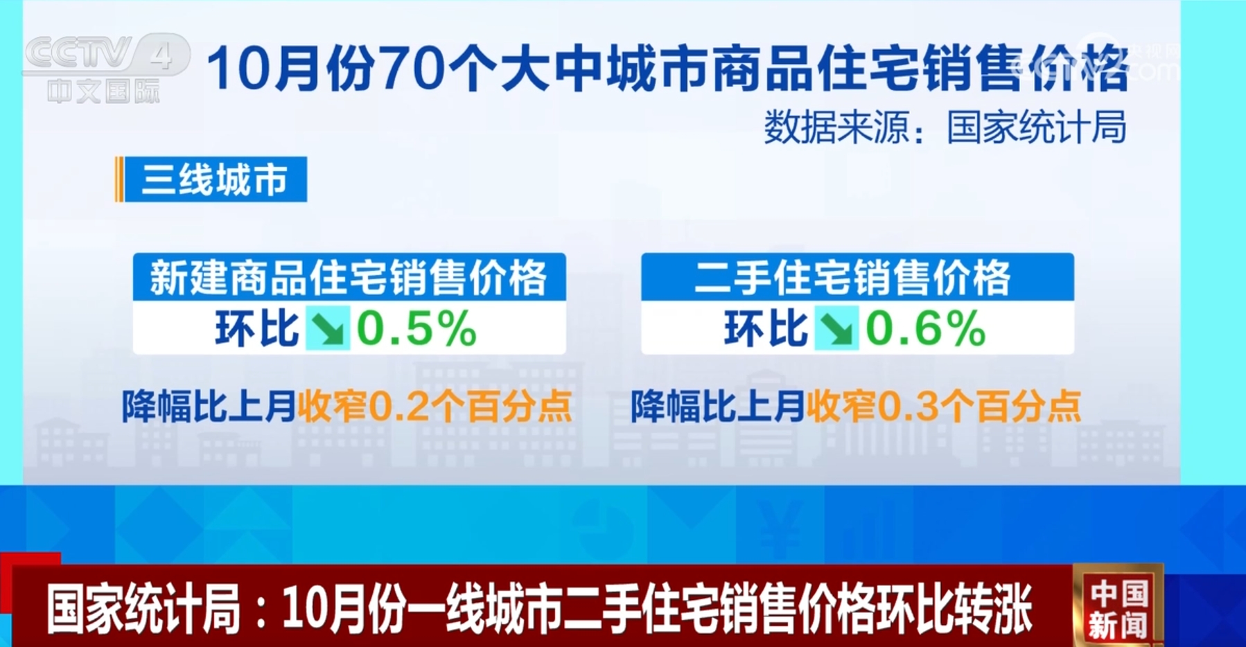 央视网消息:国家统计局11月15日发布的数据显示,10月份,70个大中城市中,各线城市商品住宅销售价格环比降幅收窄或转涨,同比降幅趋稳,房地产市场预期进一步改善。