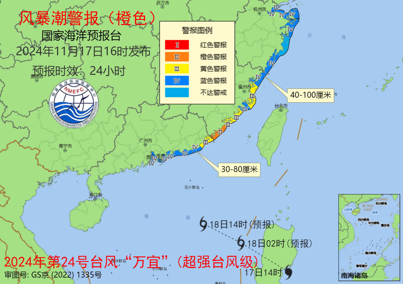 央视网消息:据国家海洋预报台网站消息,国家海洋预报台根据《海洋灾害应急预案》,发布风暴潮橙色警报。受强冷空气和今年第24号台风“万宜”(超强台风级)的共同影响,预计:17日下午到18日下午,杭州湾至福建漳州沿海将出现40到100厘米的风暴增水,广东潮州至珠江口沿海将出现30到80厘米风暴增水。福建省漳州市的风暴潮预警级别为橙色,福建省福州市、泉州市、厦门市和广东省汕头市的风暴潮预警级别为黄色,浙江省嘉兴市、绍兴市、宁波市、舟山市、温州市,福建省宁德市、莆田市,广东省汕尾市、惠州市、深圳市、广州市、中山市和珠海市的风暴潮预警级别为蓝色。上述岸段正处天文大潮期,请沿海政府及相关部门按照职责做好防御风暴潮的应急准备工作;各涉海相关生产单位采取积极有效的措施,组织渔船、养殖渔排、养殖场等做好防御工作;加固沿海渔业养殖水产设施和渔港设施,做好防潮准备。48小时预报:18日傍晚至19日下午,福建福州到雷州半岛东岸沿海将出现40到100厘米的风暴增水,海南北部和东部沿海将出现30到50厘米的风暴增水。广东省汕头市、汕尾市、惠州市、深圳市、广州市、中山市、珠海市、阳江市和茂名市的风暴潮预警级别为黄色,福建省漳州市,广东省江门市、湛江市,海南省海口市、文昌市和琼海市的风暴潮预警级别为蓝色。72小时预报:19日傍晚至20日下午,广东沿海将出现40到90厘米的风暴增水,海南北部和东部沿海将出现30到60厘米的风暴增水。广东省阳江市、茂名市,海南省海口市、文昌市和琼海市的风暴潮预警级别为黄色,广东省汕尾市、惠州市、深圳市、广州市、中山市、珠海市和湛江市的风暴潮预警级别为蓝色。