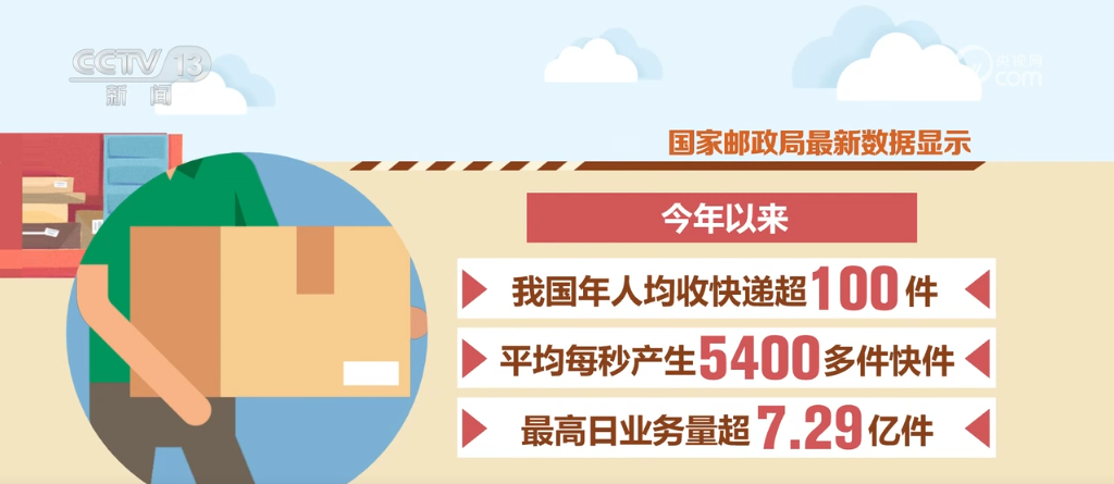 国家邮政局最新数据显示,今年以来,我国年人均收快递超100件,平均每秒产生5400多件快件,最高日业务量超7.29亿件。截至11月17日,快递年业务量首次突破1500亿件大关。