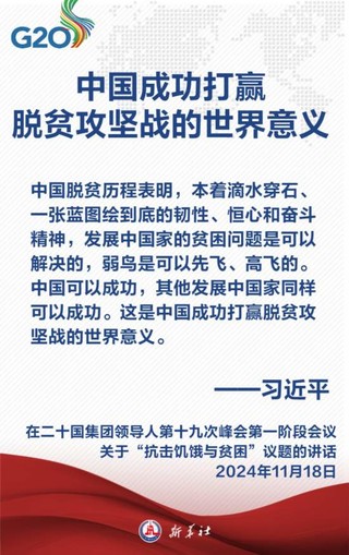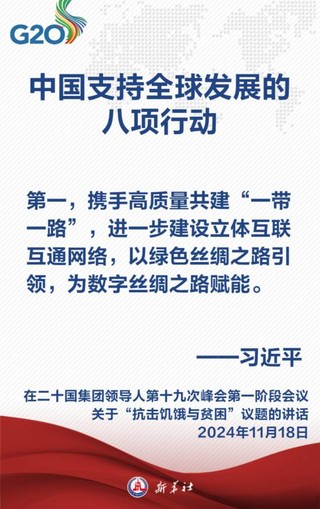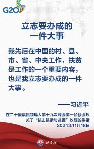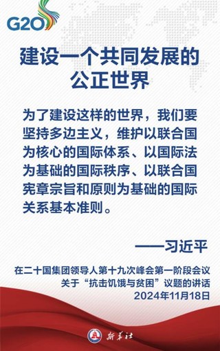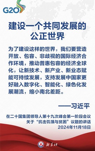 当地时间11月18日上午,国家主席习近平在巴西里约热内卢出席二十国集团领导人第十九次峰会。在峰会第一阶段围绕“抗击饥饿与贫困”议题讨论时,习近平发表题为《建设一个共同发展的公正世界》的重要讲话,这样阐述——