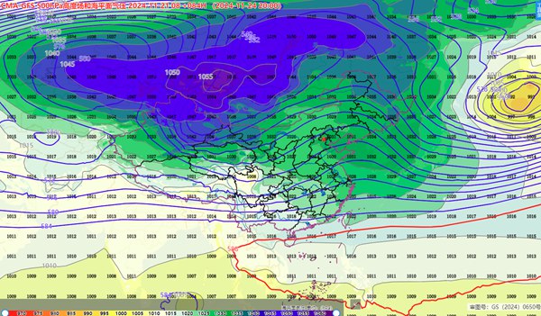 这次冷空气过程强度强,形势场上看24日前后冷高压中心强度将达1055hPa以上,表明有冷气团大量聚集。可以作为对比的是,如果你对2020年末的那场跨年寒潮还有印象,当时冷高压中心也达到了这样的强度。
