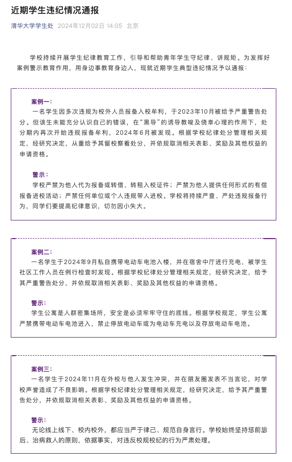 清华大学通报近期学生违纪情况:一学生在外校与他人发生冲突并发表不当言论