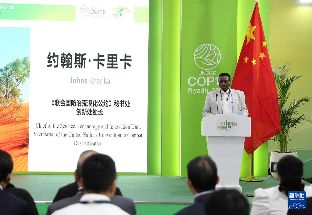 12月4日,在沙特阿拉伯利雅得《联合国防治荒漠化公约》第十六次缔约方大会(COP16)中国馆,《公约》秘书处创新处处长约翰斯·卡里卡在边会上发言。新华社记者 王东震 摄