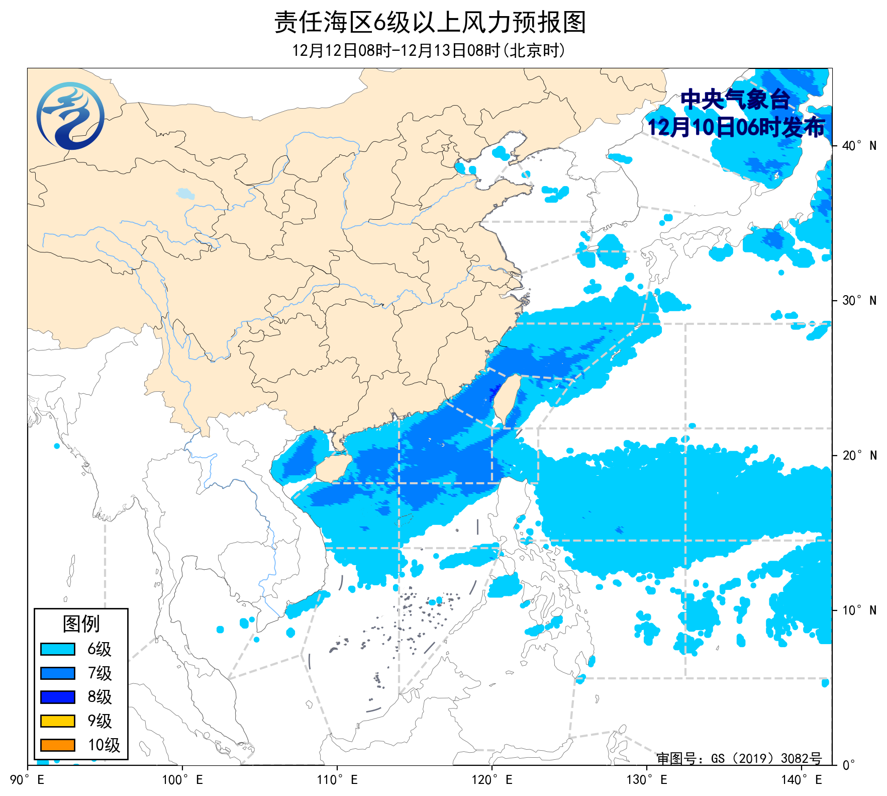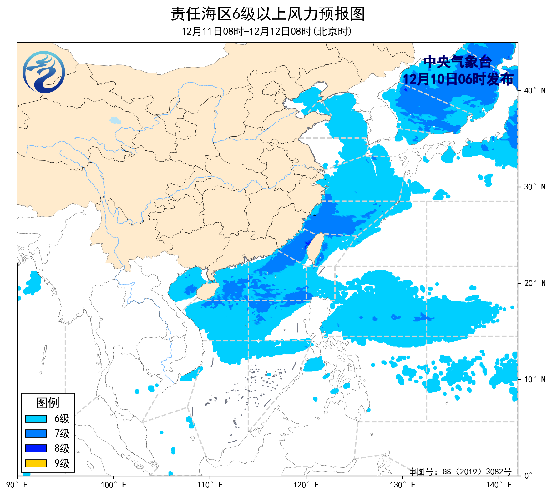 12月9日14时至10日02时,东海南部海域、台湾海峡出现了5~6级、阵风7级的偏北风,台湾以东洋面、巴士海峡、南海大部海域出现了5~7级、阵风8级的东北风或偏东风。
