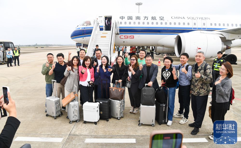 12月11日,旅客下飞机后同国产大飞机C919合影留念。