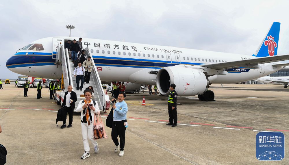 12月11日,在海口美兰国际机场,旅客走下由C919执飞的中国南航CZ6786航班。