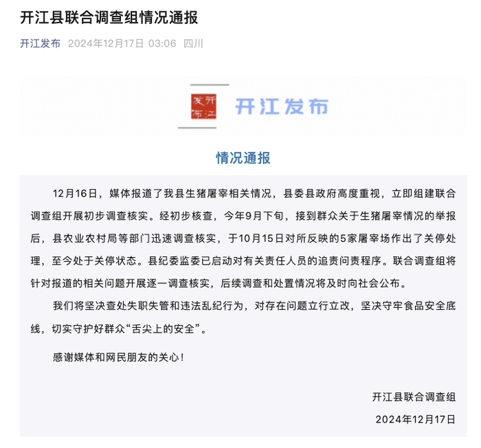 央视网消息:据“开江发布”消息,四川达州开江县联合调查组12月17日通报,12月16日,媒体报道了开江县生猪屠宰相关情况,县委县政府高度重视,立即组建联合调查组开展初步调查核实。经初步核查,今年9月下旬,接到群众关于生猪屠宰情况的举报后,开江县农业农村局等部门迅速调查核实,于10月15日对所反映的5家屠宰场作出了关停处理,至今处于关停状态。开江县纪委监委已启动对有关责任人员的追责问责程序。联合调查组将针对报道的相关问题开展逐一调查核实,后续调查和处置情况将及时向社会公布。