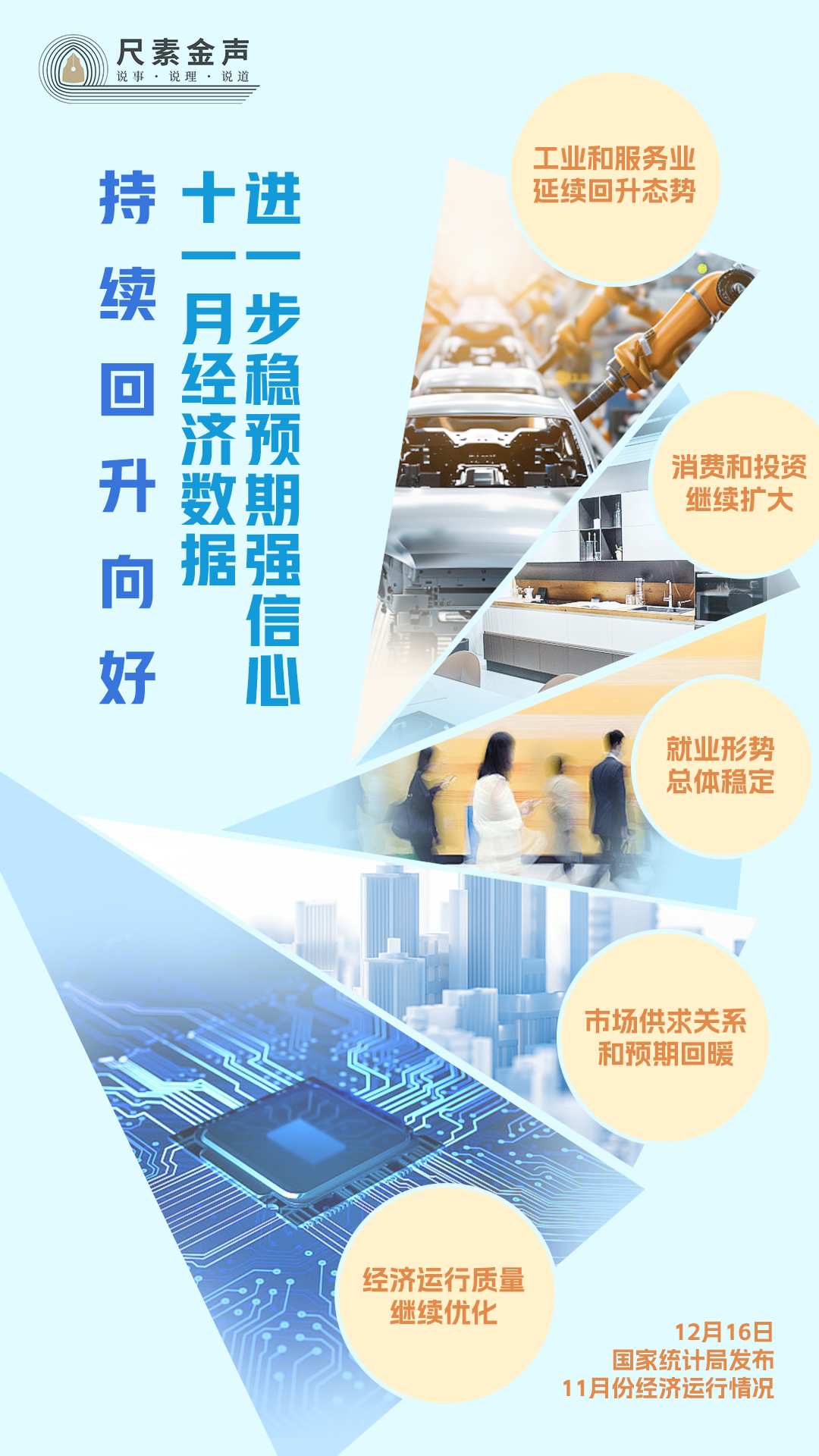 工业和服务业延续回升态势,消费和投资继续扩大,就业形势总体稳定,市场供求关系和预期回暖,经济运行质量继续优化……12月16日,国家统计局发布11月份经济运行情况。一系列回升向好的数据,显示出“稳的基础在巩固,进的力量在增强,积极因素继续增多”,充分彰显了宏观调控的有力有效。
