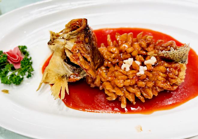 尺把长的鳜鱼在盘中昂头翘尾,鱼身去骨,改上花刀,油炸后端上桌,再浇上酸甜的番茄汁,鱼身吱吱作响,像极了松鼠的叫声,外酥里嫩,酸甜美味。一块入口,满口留香。