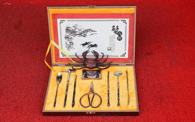 吃大闸蟹的乐趣,不在于结果,而在于过程。大闸蟹外壳坚硬,不易拆分,苏州人为了让吃蟹成为一件风雅之事,可谓煞费苦心。据说,明代一位叫漕书的苏州人,发明了锤、刀、钳三件工具来对付螃蟹的硬壳,后来逐渐成为八件,也就是现在的“蟹八件”,时人写诗调侃:“锤敲蟹壳唱八件,金锯剖螯举觞鲜。吟诗赏菊人未醉,舞钩玩镊乐似仙。”可见江南人对优雅用餐的追求。