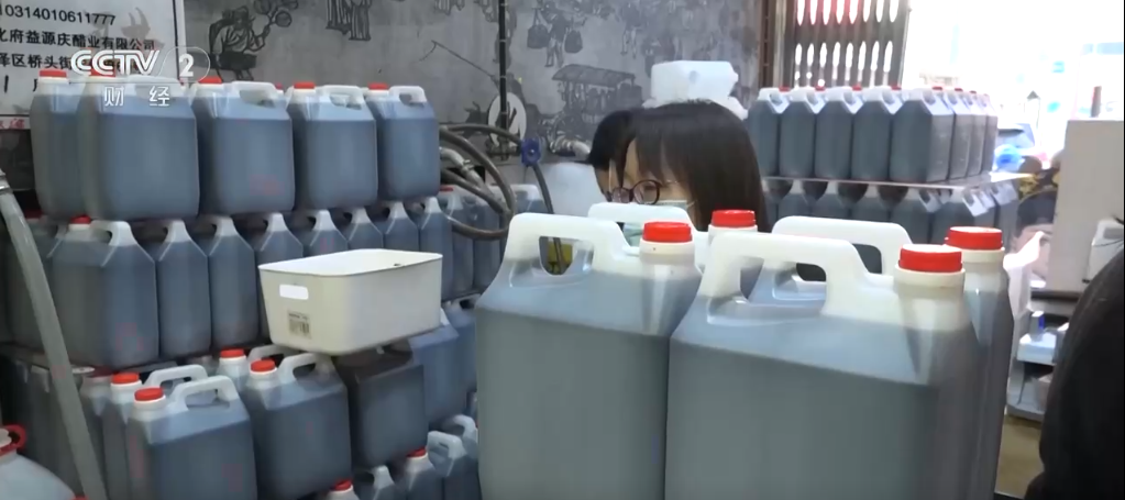 冒着热气的老陈醋顺着管子流入容器中,弥漫出浓郁的醋香。店内是熙熙攘攘的打醋市民,大家大多使用自己的各类容器进行盛装,多以大容量的桶、壶为主。