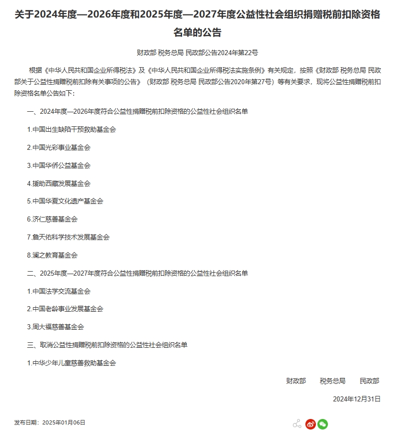央视网消息:财政部、税务总局、民政部日前发布公益性社会组织捐赠税前扣除资格名单。