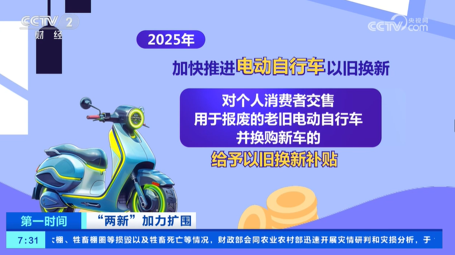2025年,加快推进电动自行车以旧换新。对个人消费者交售用于报废的老旧电动自行车并换购新车的,给予以旧换新补贴;对交售用于报废的老旧锂离子蓄电池电动自行车并换购铅酸蓄电池电动自行车新车的,可适当加大补贴力度。