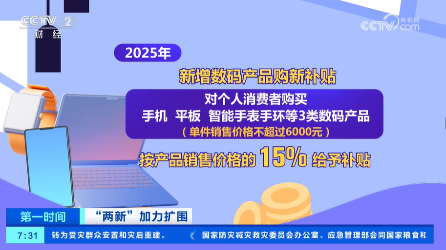 2025年,新增数码产品购新补贴。对个人消费者购买手机、平板、智能手表手环等3类数码产品(单件销售价格不超过6000元),按产品销售价格的15%给予补贴,每位消费者每类产品可补贴1件,每件补贴不超过500元。