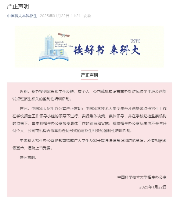 中科大严正声明:从未与个人、机构等合作举办招生相关盈利性培训活动