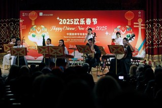 这场“2025欢乐春节—中国旋律专场音乐会”以欢快的合奏《金蛇狂舞》拉开序幕。乐团成员们演奏了《江南美》《采茶舞曲》《出水莲》等民族乐曲,生动展现了江南水乡的柔美意境,并通过乐曲向罗马尼亚民众介绍了三弦、琵琶、扬琴、二胡、竹笛、笙、古筝等中国传统乐器。