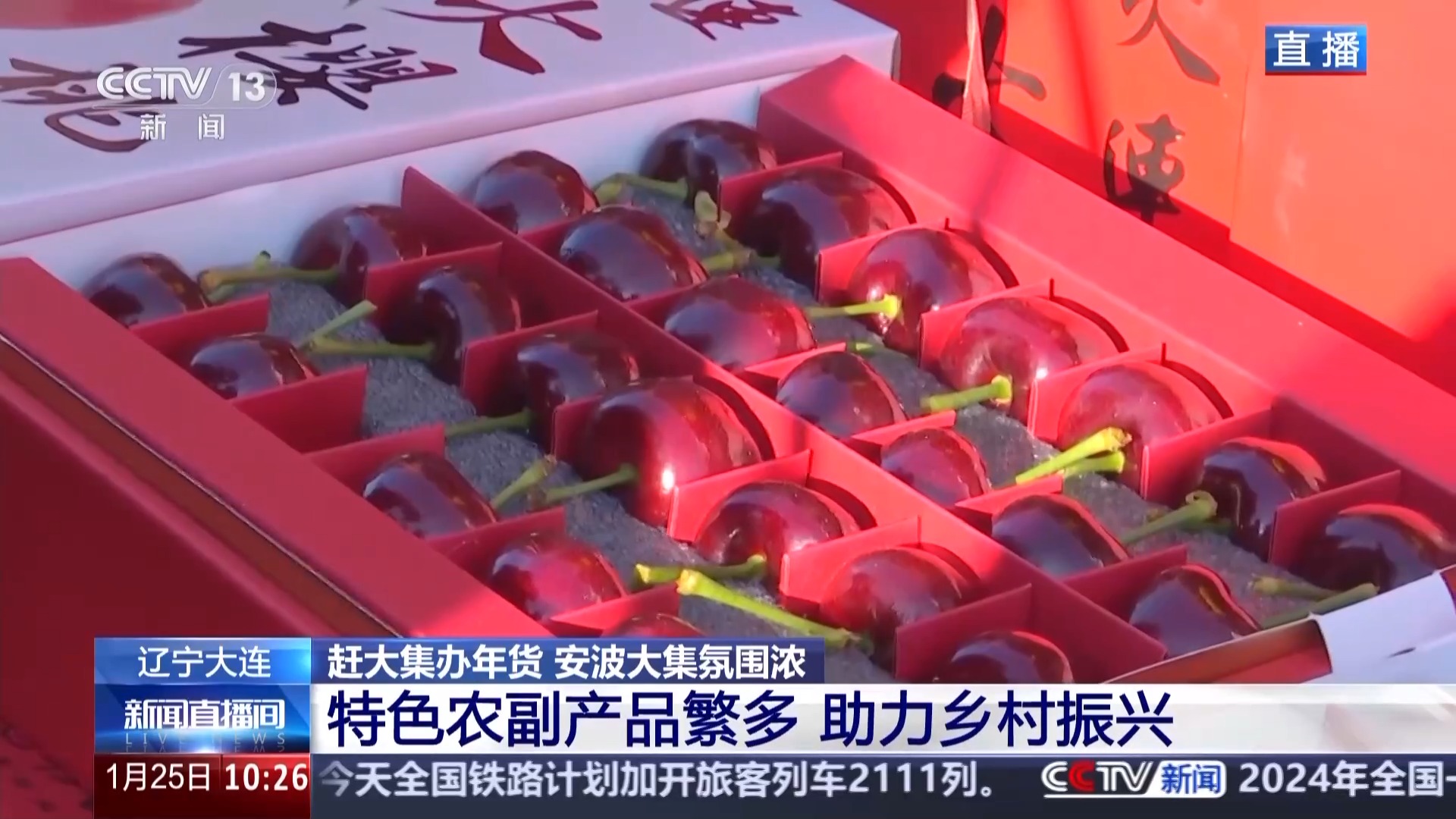 总台记者 陶泽文:同样卖得特别好的还有四平大樱桃,四平是指这里的四平街道。近4000座新型大棚通过智能控温和空调进棚方式,实现樱桃最早在元旦前后就能上市,个大味美的四平大樱桃为大家春节的餐桌增添一份甜美。