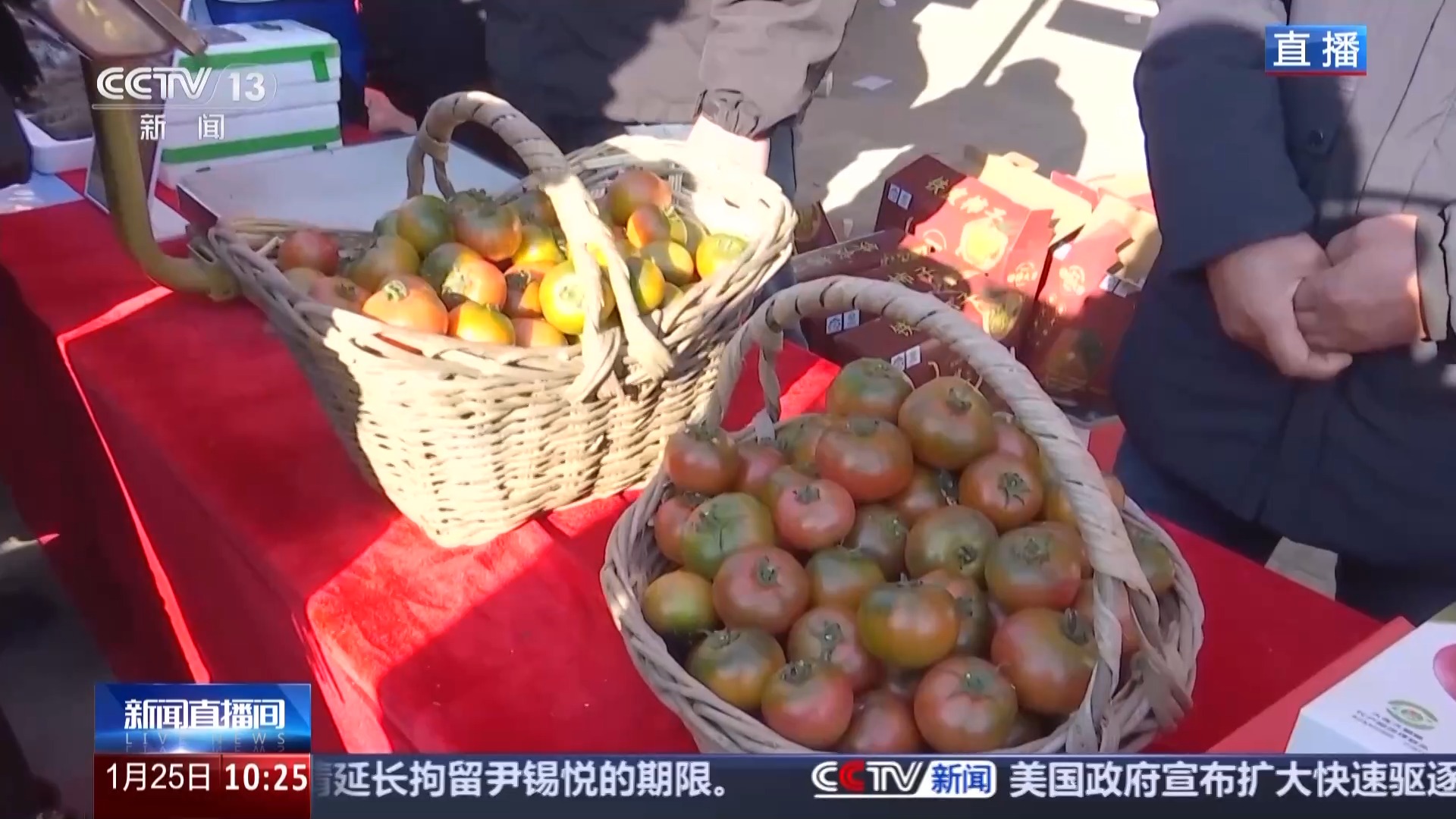 总台记者 陶泽文:给大家简单介绍几种大集上的爆款。首先就是铁柿子,老牌明星了,很多来逛集的人都会买上一些。它是西红柿的一种,比咱们常吃的西红柿要硬,所以得名铁柿子,尝起来是酸甜脆爽。安波产的铁柿子不但在大集上热销,如今还从这里走向了全国,不论是北京的新发地,还是上海的江南市场,都有它的身影,小小的铁柿子为当地村民带来超1亿元年产值。