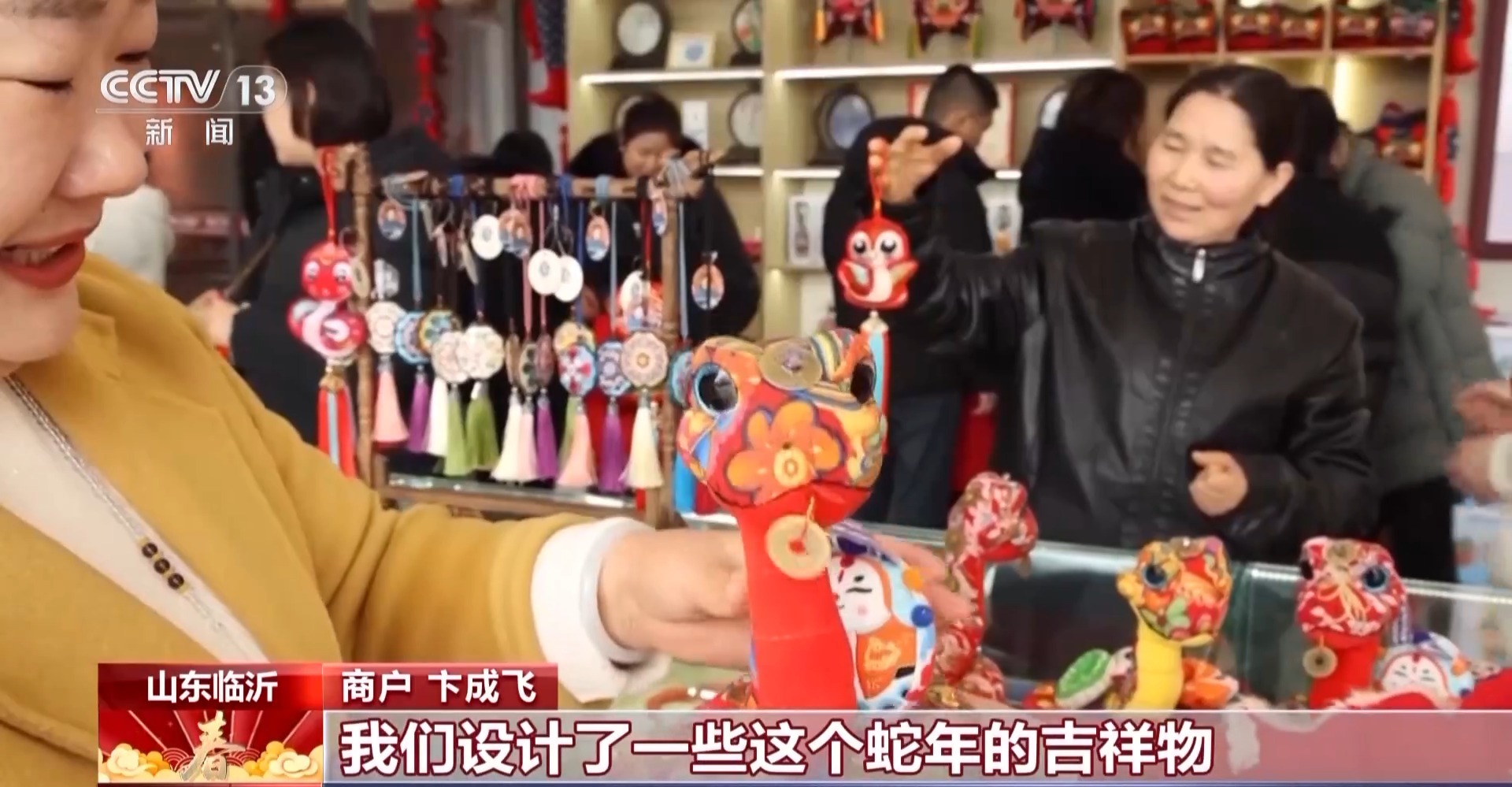 山东临沂 商户 卞成飞:过春节喜欢好吃的、好喝的,买一套新衣服穿。现在随着生活水平提高了,大家都喜欢一些文化产品,蛇年我们设计了一些蛇年的吉祥物,这是“蛇盘兔”,来年必定富。