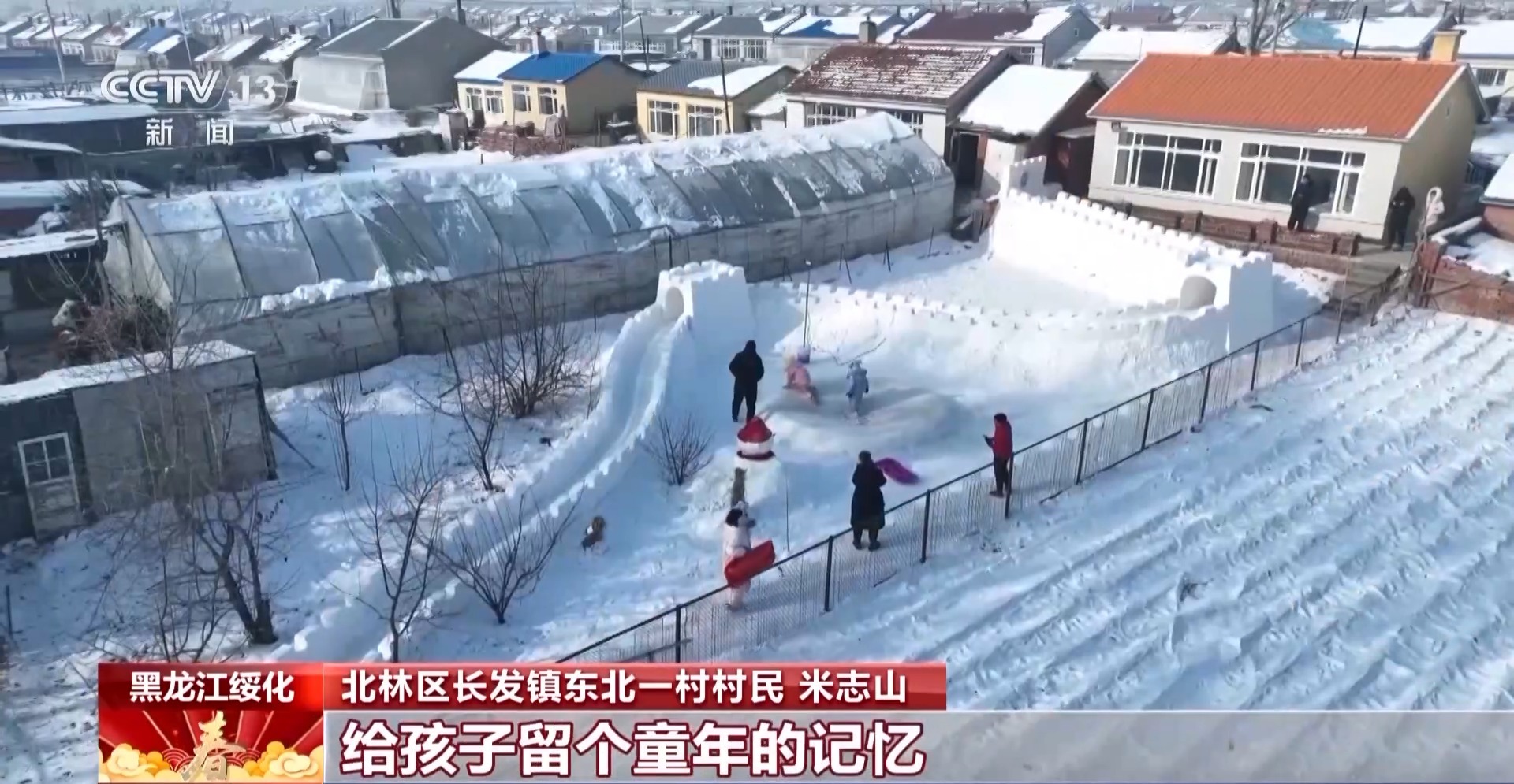 北林区长发镇东北一村村民 米志山:都是自己整的,雪是从外边拉回来的,全是为了小孙子,给孩子留个童年的记忆。