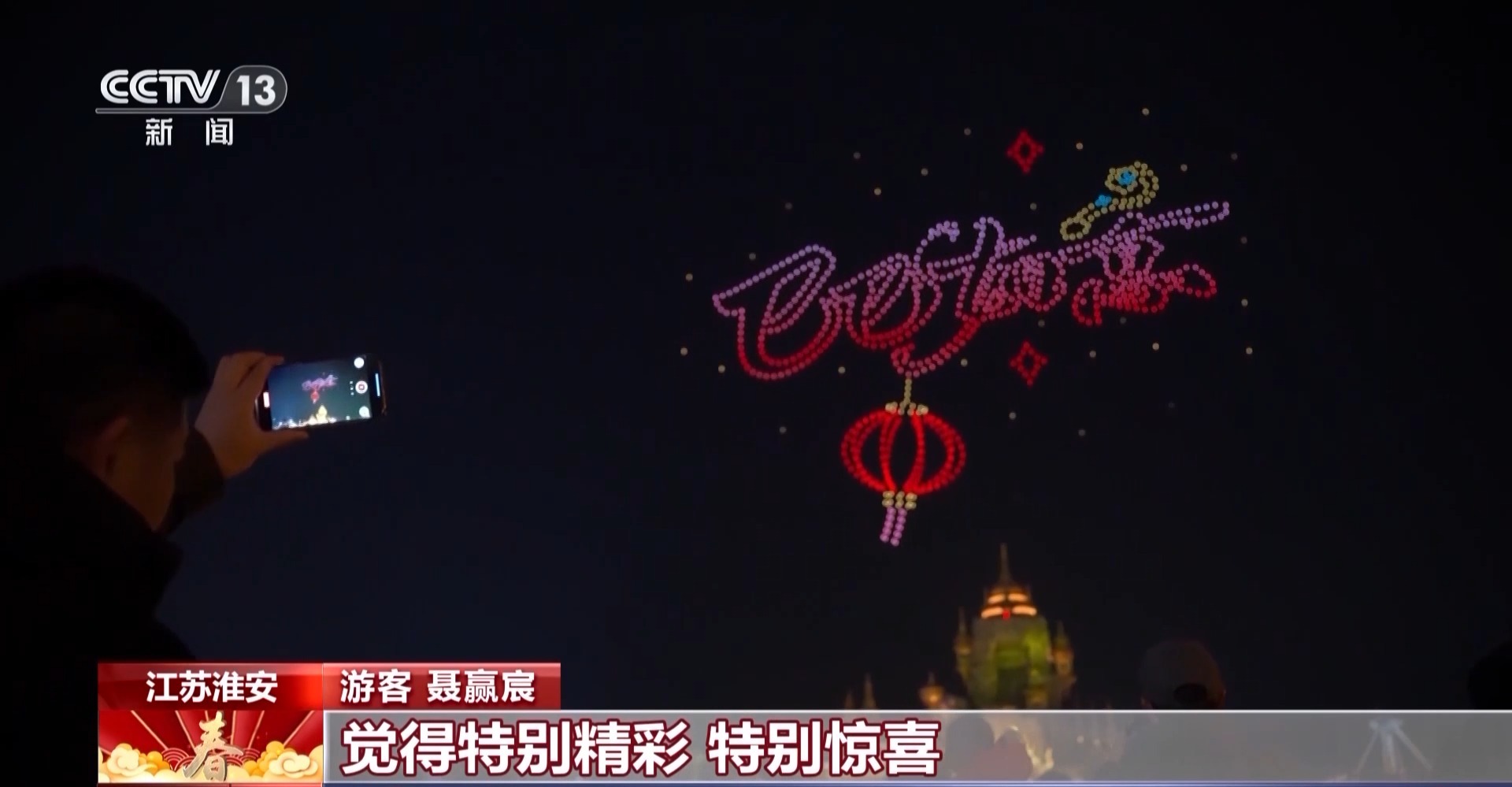 江苏淮安 游客 聂赢宸:现在春节的气氛,相比我们小时候有很多科技的元素,所以对于现在这代孩子的成长来说,蛮不一样的,很创新的东西。比如巴黎奥运会上无人机加冷烟火的的表演,没想到在这里能够看到,觉得特别精彩、特别惊喜,是科技赋能美好生活的一种特别浪漫的体现。