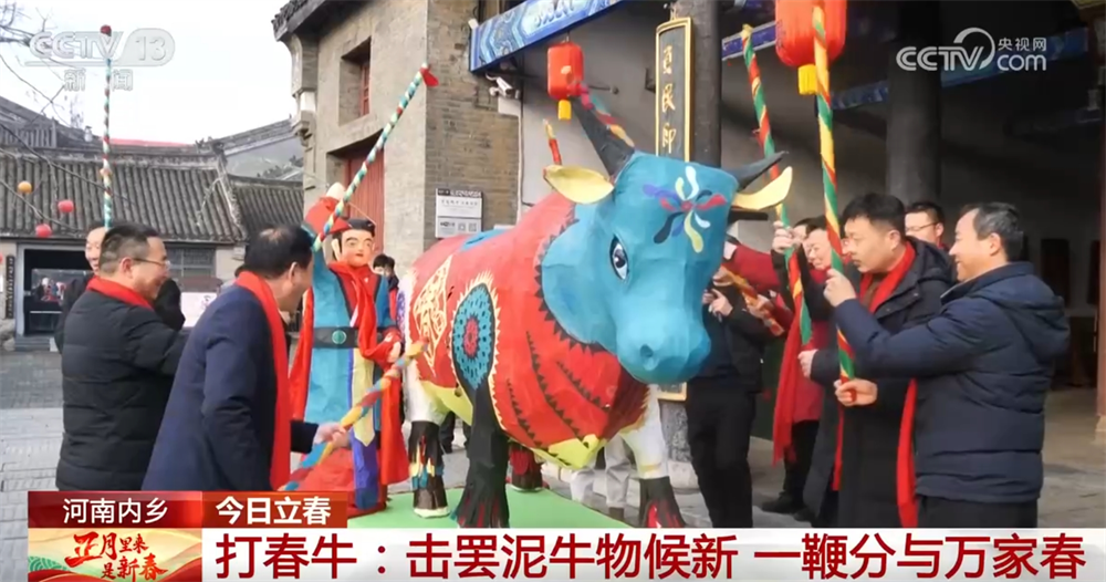 在河南南阳的内乡县,有着立春节气“打春牛”的民俗。打春牛又称“鞭春”。春牛的制作,以竹子为骨架,用多层纸贴糊而成,最后上彩点睛。春牛的肚中会放入五谷、干果。立春日,迎春的人们绕牛三圈,鞭打春牛,并打破牛肚,然后抢食其中的五谷、干果,期盼五谷丰登、吉年有余,这也承载了人们对新的一年再获丰收的美好期待。